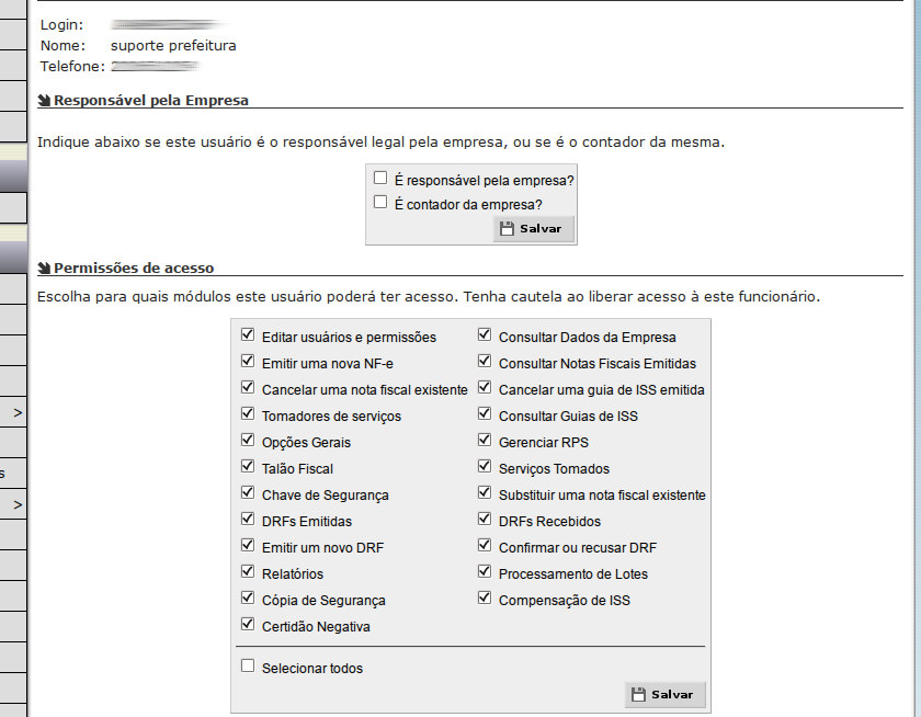 3) Selecione se o usuário selecionado é o responsável pela empresa, se é o contador e salve. Defina depois as permissões de acesso que este usuário deverá ter. Opcionalmente você poderá selecionar todos. Clique em Salvar para confirmar as alterações. Caso você deseja ignorar as alterações, simplesmente acesse outro menu.